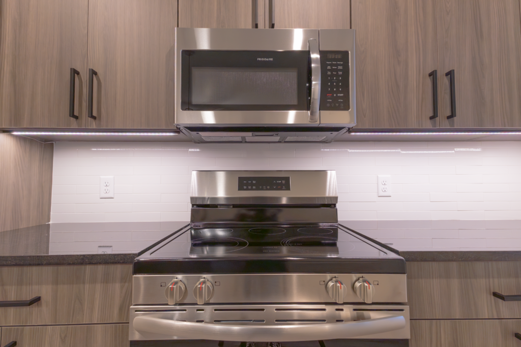 Complete set of stainless steel kitchen appliances including a fridge, microwave, stove, and dishwasher.